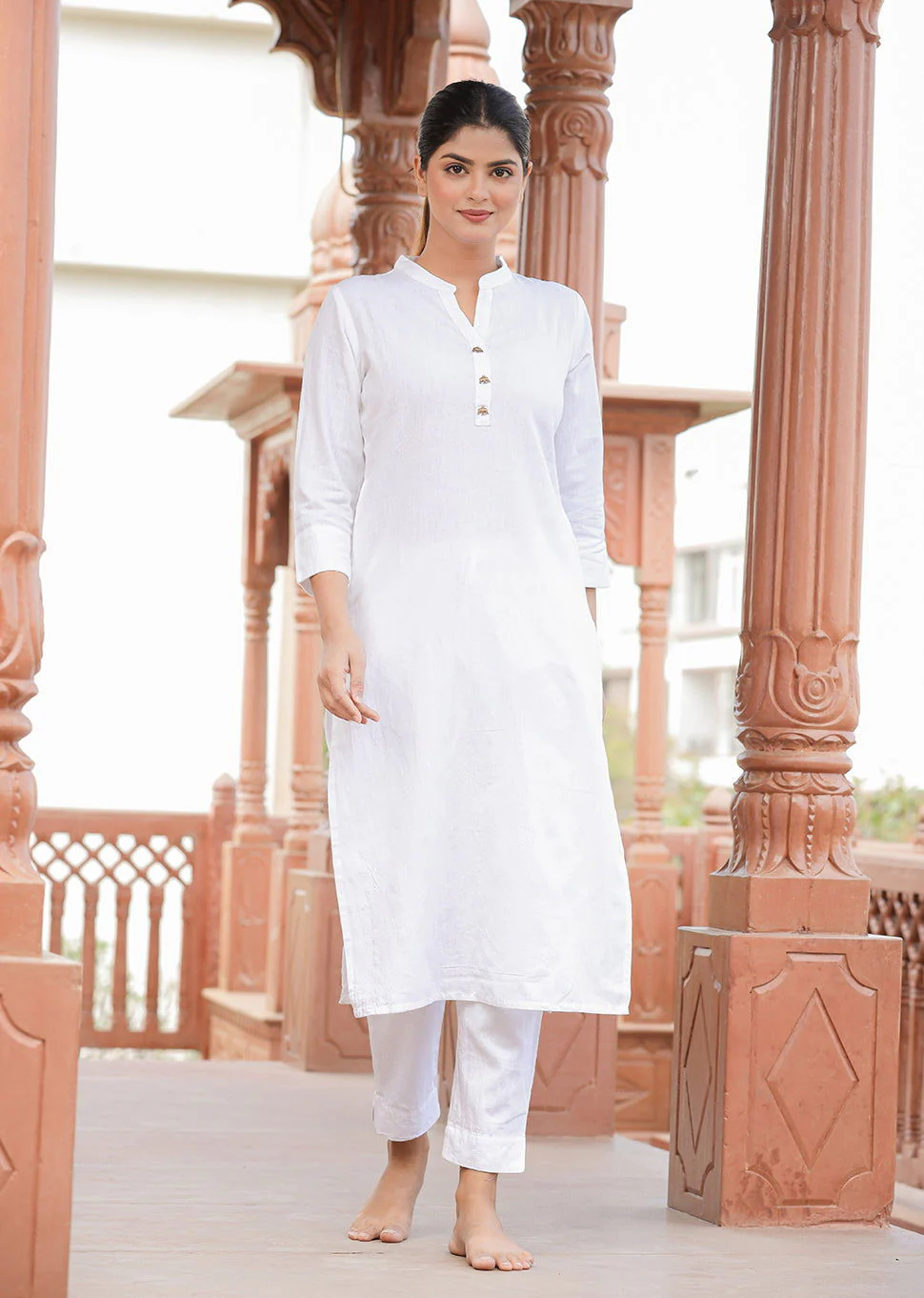 An elegant and classic white cotton kurta-pants set, perfect for comfortable daily wear.