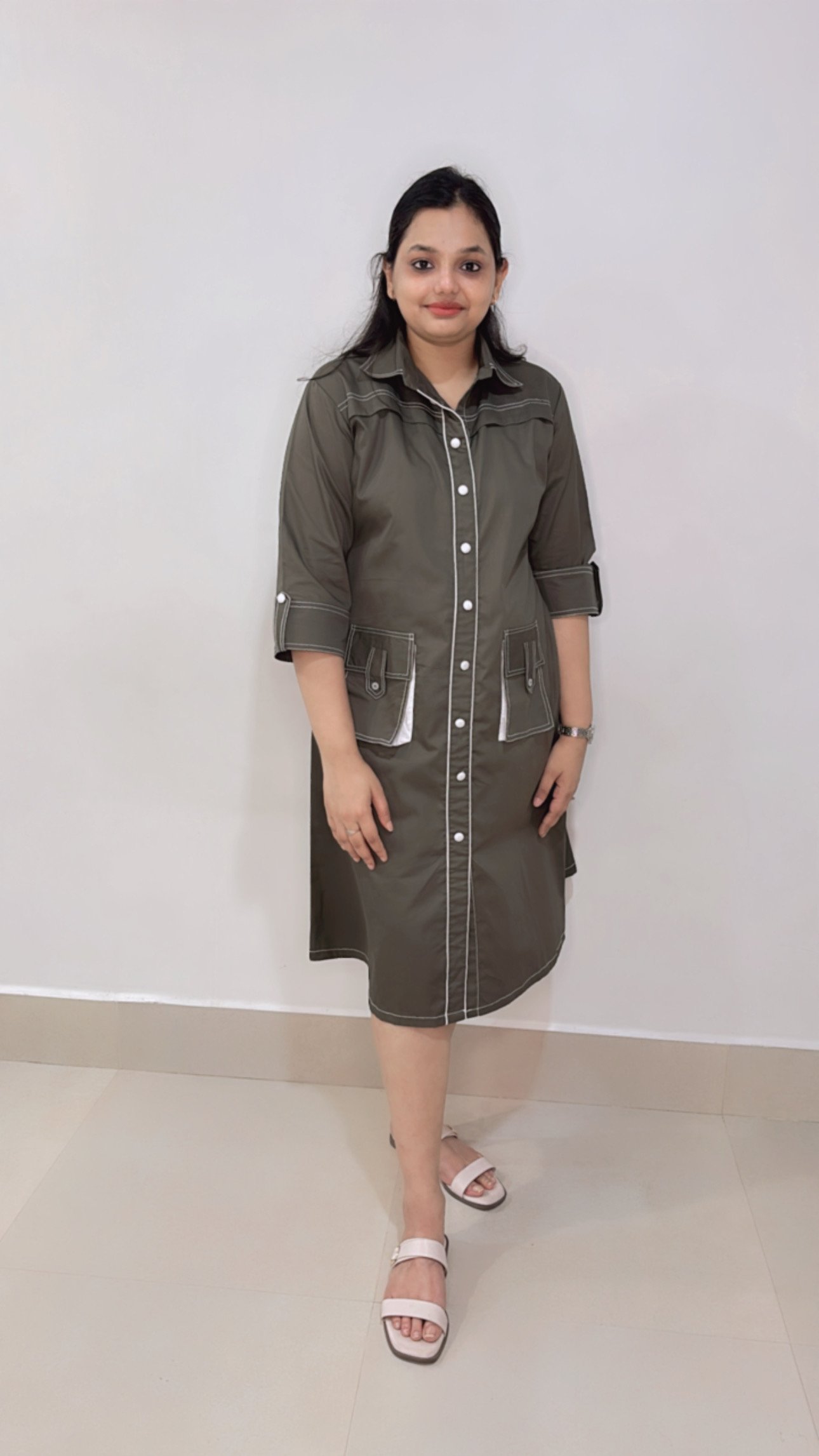 This olive green dress with beautiful pocket detailing is crafted from soft cotton poplin in a rich olive green hue, offering a perfect blend of style and comfort. The design features elegant white stitching along the pockets and buttoned front, creating a chic and versatile look ideal for casual or semi-formal occasions.
